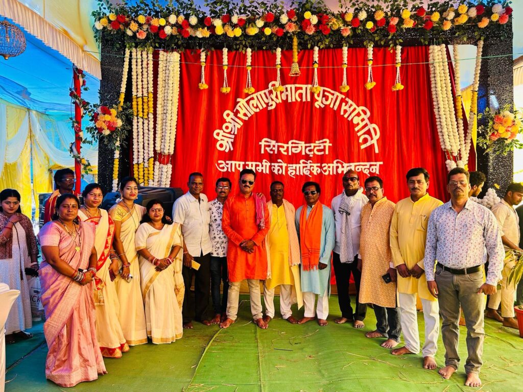 श्री सोलापुरी माता पुजा उत्सव वार्ड नंबर 12 सिरगिट्टी रुचिका विहार शुभम विहार सिरगिट्टी में आयोजित पूजा के अंतिम दिन रविवार को दोपहर 12,30 देवी मां को 21 प्रकार का महा भोग चढ़ाया गया खड़कपुर से आए पुजारी टी भास्कर राव ने बताया कि यह भोग इसलिए महत्व होता है क्योंकि देवी मां को 7 दिनों तक जो भी भोग प्रसाद देवी मां को चढ़ाया जाता है उसमें भूल वश प्रसाद अर्पण करने में अगर कुछ छूट गया है तो उसकी भरपाई हेतु (कुंबम) चढ़ाया जाता है। यह महाभोग महिलाएं शुद्ध वातावरण में स्नान ध्यान पूजा अर्चना करने के पश्चात पकवान बनाते हैं। अर्पण करने हेतु पुजारी द्वारा पूजा पंडाल में देवी के सामने बड़ा सा कुंभ बनाते है। 21 बड़े बड़े थाल में 21 महिलाए पकवान को अपने सिर पर रख कर ढोल ताशा बाजा,डफली बजा,के साथ शोभा यात्रा के माध्यम से माता के सामने निर्मित कुंभ में पुजारी जी के मंत्रोच्चार के साथ महा भोग माताजी को अर्पण किया जाता है। कल के कुंभम पूजा करने बिलासपुर नगर निगम की महापौर श्रीमती पूजा विधानी, संयुक्त तेलुगू समाज के अध्यक्ष बी वेणुगोपाल राव, प्रखर पत्रकार महासंघ प्रदेश अध्यक्ष विनय मिश्रा, प्रेस क्लब के सदस्य गुड्डा सदाफले सेवन स्टार म्यूजिकल ग्रुप के डायरेक्टर राकेश रोशन साह शिक्षक ओम प्रकाश जायसवाल तेलुगु समाज के सम्मानित सदस्य बी रमेश कुमार उनकी धर्मपत्नी पद्मजा पूजा स्थल में उपस्तिथ होकर पूजा अर्चना की है।